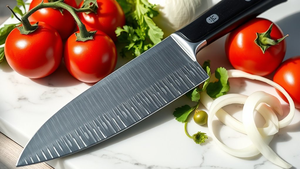 A comfortable handle is key to getting the most out of your santoku knife, especially for beginners who are still building their technique. A handle that fits well reduces hand fatigue during extended use, making chopping easier and safer. An ergonomic grip design ensures you maintain secure control, even if your hands are wet or greasy, preventing slips. Handles made from materials like Pakkawood or textured plastics offer better grip stability for precise cuts. Full-tang construction in the handle improves balance and control, enhancing safety and ease of maneuvering. When the handle feels natural in your hand, it boosts comfort and minimizes the risk of repetitive strain injuries over time. Choosing a handle that matches your grip style is essential for confident, comfortable slicing.