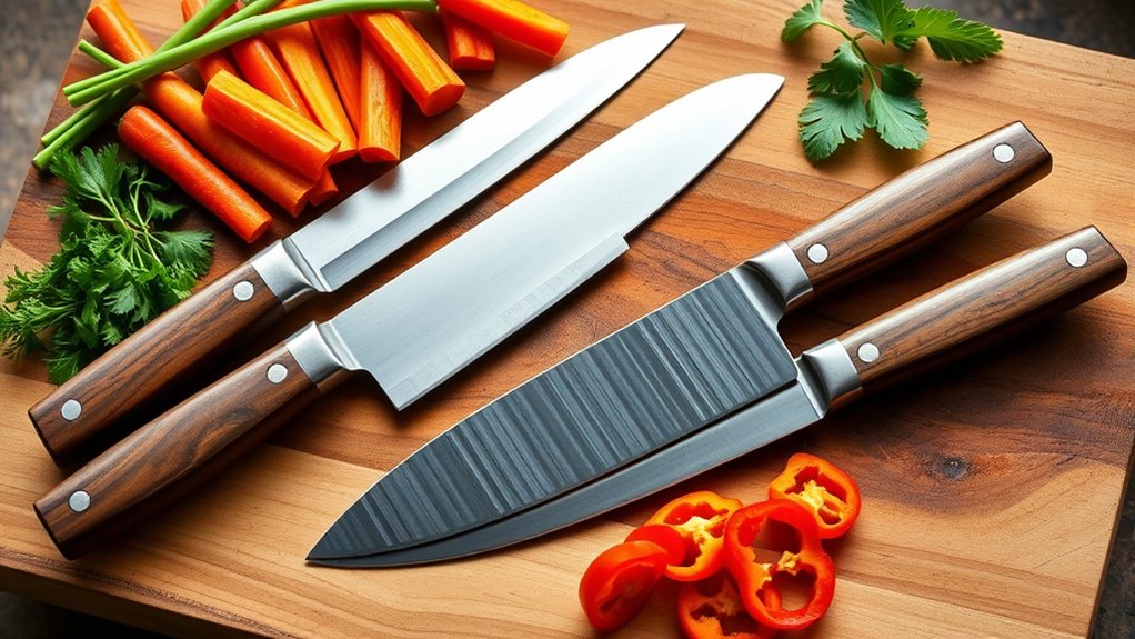 I find that a Granton edge, with its scalloped blade, really enhances my vegetable slicing precision. The tiny air pockets reduce sticking, making it easier to get clean, even cuts. This design allows me to work faster and more accurately, especially with slippery or delicate veggies. If you want slicing sharpness and control, look for a santoku with a Granton edge—it’s a game-changer for vegetable prep.