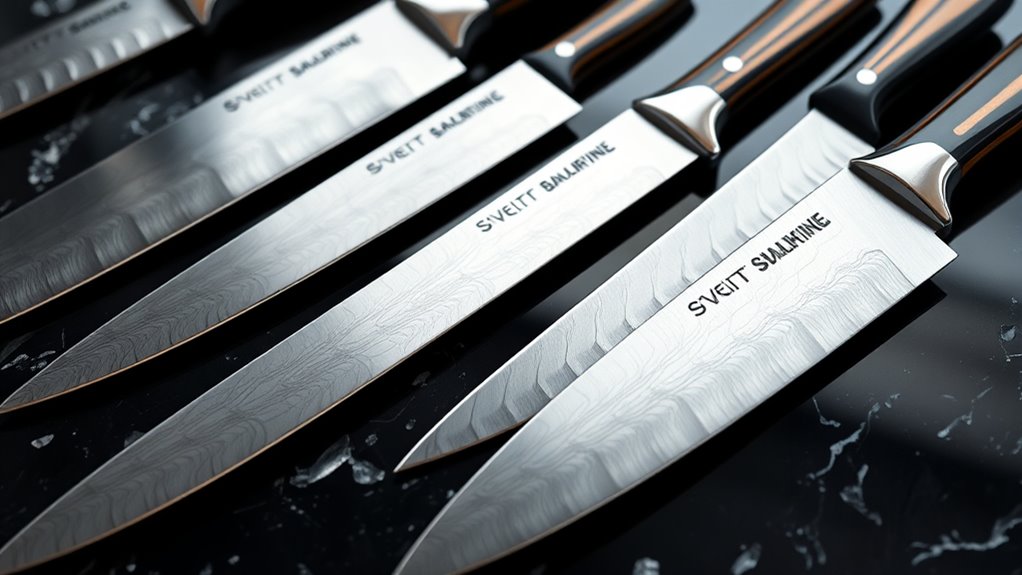 Ever wonder how handle material shapes your grip and comfort? I find that premium materials like ebony or micarta provide a secure, ergonomic hold, even during extended use. They feel warm in my hand and reduce slipping, making slicing smoother. Softer woods or plastic handles might be less comfortable and less durable. Choosing the right material transforms a good knife into a truly comfortable, reliable tool I enjoy using every time.