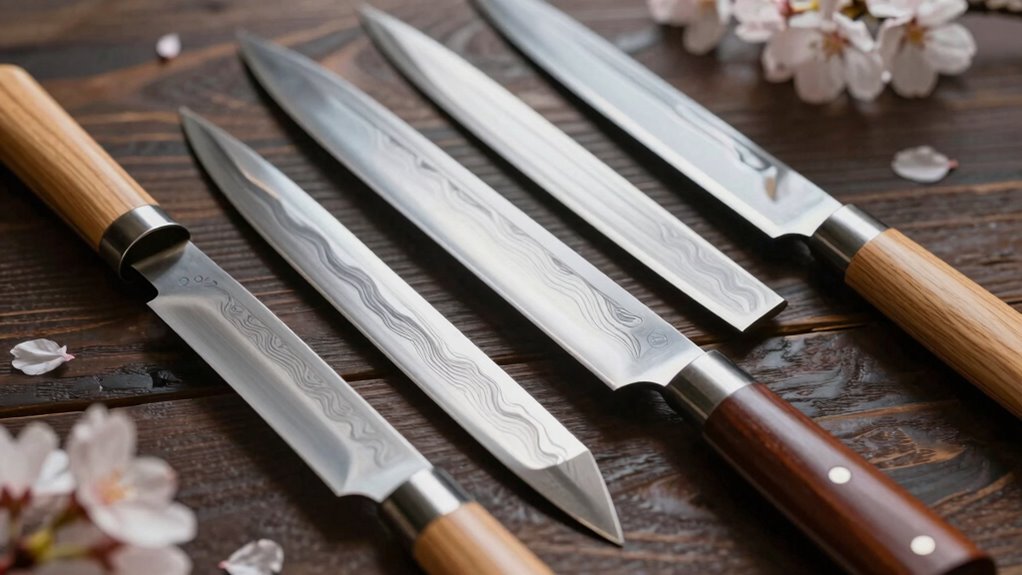 Since high-carbon steel is common in traditional Japanese knives, regular oiling and careful cleaning are essential to prevent rust and corrosion. I recommend wiping down the blade after each use and occasionally applying food-grade mineral oil to maintain its condition. Hand-forged knives tend to have a delicate edge, so frequent honing and sharpening are necessary to keep them performing at their best. Durability depends on the quality of the steel and forging process—well-made knives can last for decades if properly cared for. The handle material, like rosewood or sourwood, may need occasional conditioning to prevent cracking or drying out. Proper storage, such as in a knife guard or wooden box, is vital to protect the blade’s edge and extend its lifespan.
